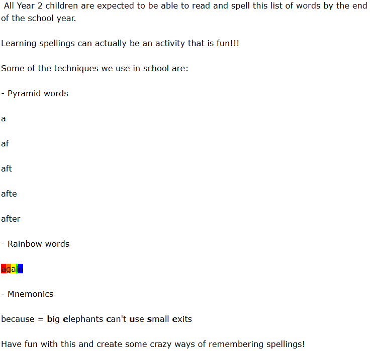 Across the school, children will be provided with a list of spellings that link to the spelling work they are doing within their year group. You can choose to practice some or all of the words with your child each week at home.